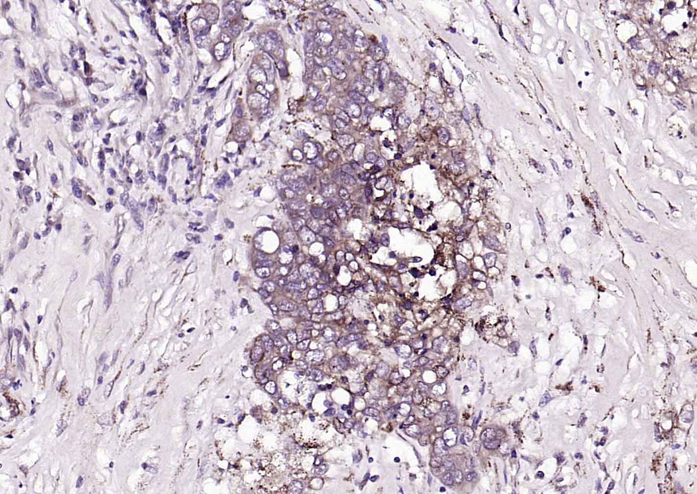 Paraformaldehyde-fixed, paraffin embedded (human breast carcinoma); Antigen retrieval by boiling in sodium citrate buffer (pH6.0) for 15min; Block endogenous peroxidase by 3% hydrogen peroxide for 20 minutes; Blocking buffer (normal goat serum) at 37°C for 30min; Incubation with (TGF beta Receptor II) Polyclonal Antibody, Unconjugated (bs-0117R) at 1:200 overnight at 4°C, followed by operating according to SP Kit(Rabbit) (sp-0023) instructionsand DAB staining.