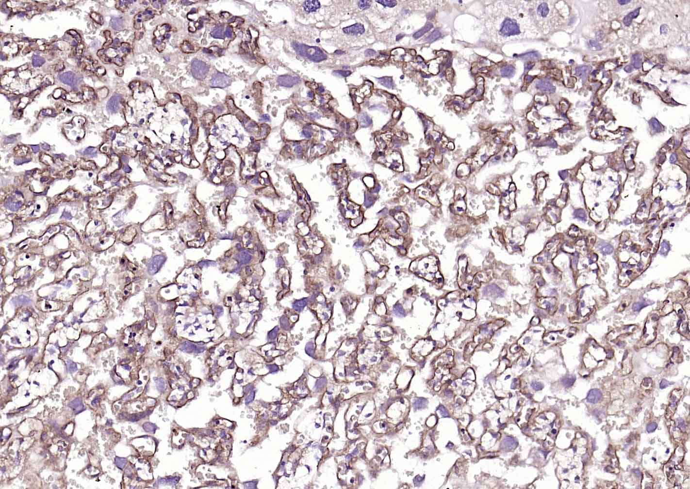 Paraformaldehyde-fixed, paraffin embedded (rat placenta); Antigen retrieval by boiling in sodium citrate buffer (pH6.0) for 15min; Block endogenous peroxidase by 3% hydrogen peroxide for 20 minutes; Blocking buffer (normal goat serum) at 37°C for 30min; Incubation with (TGF beta Receptor II) Polyclonal Antibody, Unconjugated (bs-0117R) at 1:200 overnight at 4°C, followed by operating according to SP Kit(Rabbit) (sp-0023) instructionsand DAB staining.