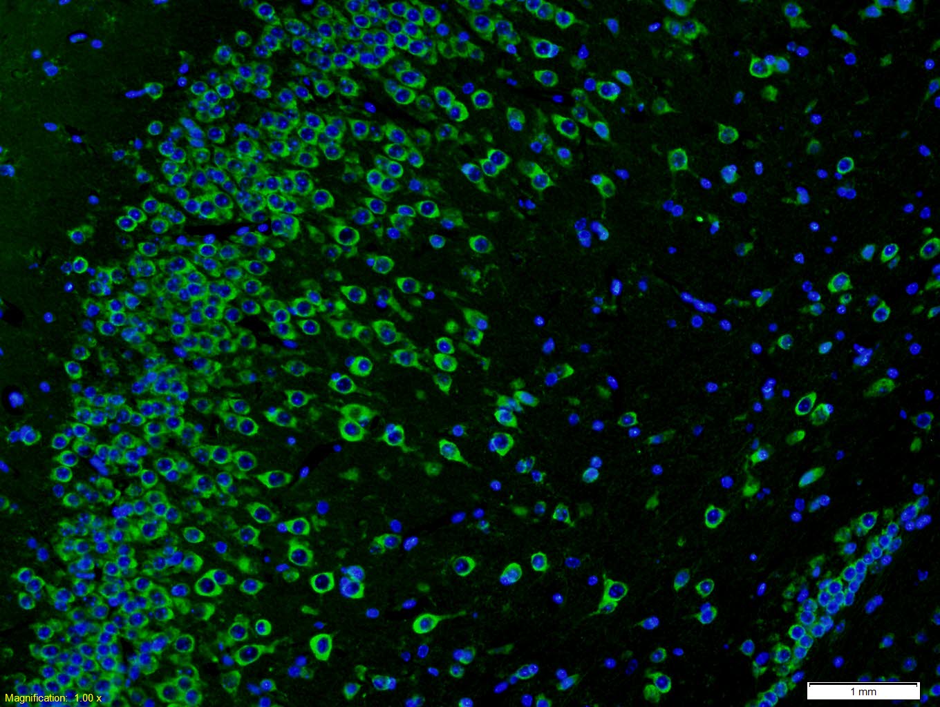 Paraformaldehyde-fixed, paraffin embedded (Mouse brain); Antigen retrieval by boiling in sodium citrate buffer (pH6.0) for 15min; Block endogenous peroxidase by 3% hydrogen peroxide for 20 minutes; Blocking buffer (normal goat serum) at 37°C for 30min; Antibody incubation with (AKAP12) Polyclonal Antibody, Unconjugated (bs-1381R) at 1:400 overnight at 4°C, followed by a conjugated secondary antibody (bs-0295G-FITC) for 90 minutes, and DAPI for nuclei staining.