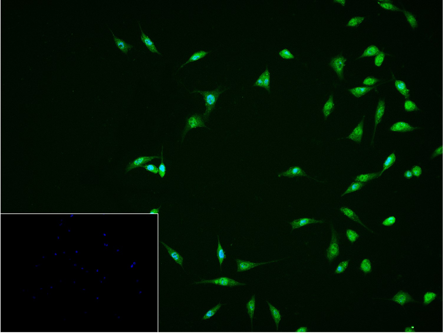 A431 cell; 4% Paraformaldehyde-fixed; Triton X-100 at room temperature for 20 min; Blocking buffer (normal goat serum, C-0005) at 37°C for 20 min; Antibody incubation with (PPARGC1A) polyclonal Antibody, Unconjugated (bs-1832R) 1:50, 90 minutes at 37°C; followed by a conjugated Goat Anti-Rabbit IgG antibody at 37°C for 90 minutes, DAPI (blue, C02-04002) was used to stain the cell nuclei.