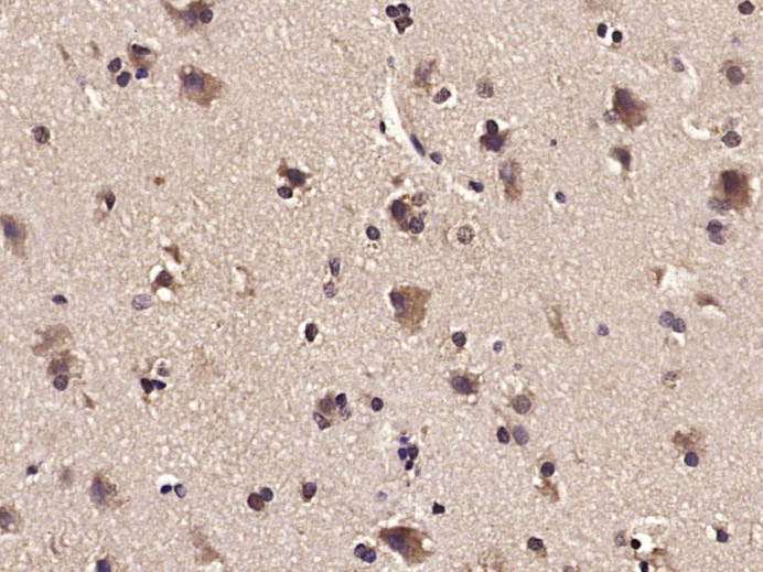 Paraformaldehyde-fixed, paraffin embedded (rat brain); Antigen retrieval by boiling in sodium citrate buffer (pH6.0) for 15min; Block endogenous peroxidase by 3% hydrogen peroxide for 20 minutes; Blocking buffer (normal goat serum) at 37°C for 30min; Antibody incubation with (PIK3R2) Polyclonal Antibody, Unconjugated (bs-4160R) at 1:200 overnight at 4°C, followed by operating according to SP Kit(Rabbit) (sp-0023) instructionsand DAB staining.