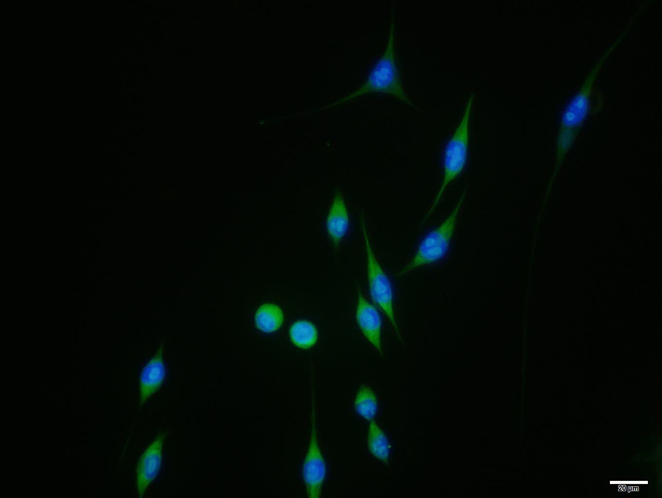 NIH/3T3 cell; 4% Paraformaldehyde-fixed; Triton X-100 at room temperature for 20 min; Blocking buffer (normal goat serum, C-0005) at 37°C for 20 min; Antibody incubation with (phospho-RPS6KB1 (Ser417) polyclonal Antibody, Unconjugated (bs-5668R) 1:100, 90 minutes at 37°C; followed by a conjugated Goat Anti-Rabbit IgG antibody at 37°C for 90 minutes, DAPI (blue, C02-04002) was used to stain the cell nuclei.
