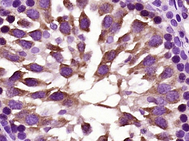 Paraformaldehyde-fixed, paraffin embedded (Rat testis); Antigen retrieval by boiling in sodium citrate buffer (pH6.0) for 15min; Block endogenous peroxidase by 3% hydrogen peroxide for 20 minutes; Blocking buffer (normal goat serum) at 37°C for 30min; Antibody incubation with (Fbx15) Polyclonal Antibody, Unconjugated (bs-8396R) at 1:400 overnight at 4°C, followed by operating according to SP Kit(Rabbit) (sp-0023) instructionsand DAB staining.