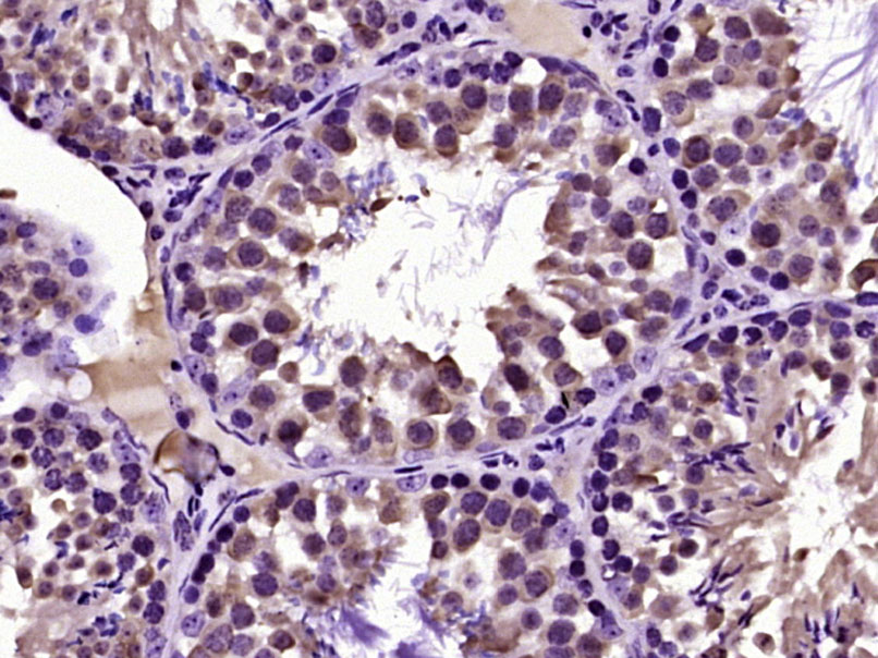 Paraformaldehyde-fixed, paraffin embedded (Mouse testis); Antigen retrieval by boiling in sodium citrate buffer (pH6.0) for 15min; Block endogenous peroxidase by 3% hydrogen peroxide for 20 minutes; Blocking buffer (normal goat serum) at 37°C for 30min; Antibody incubation with (C4orf22) Polyclonal Antibody, Unconjugated (bs-9991R) at 1:400 overnight at 4°C, followed by operating according to SP Kit(Rabbit) (sp-0023) instructionsand DAB staining.