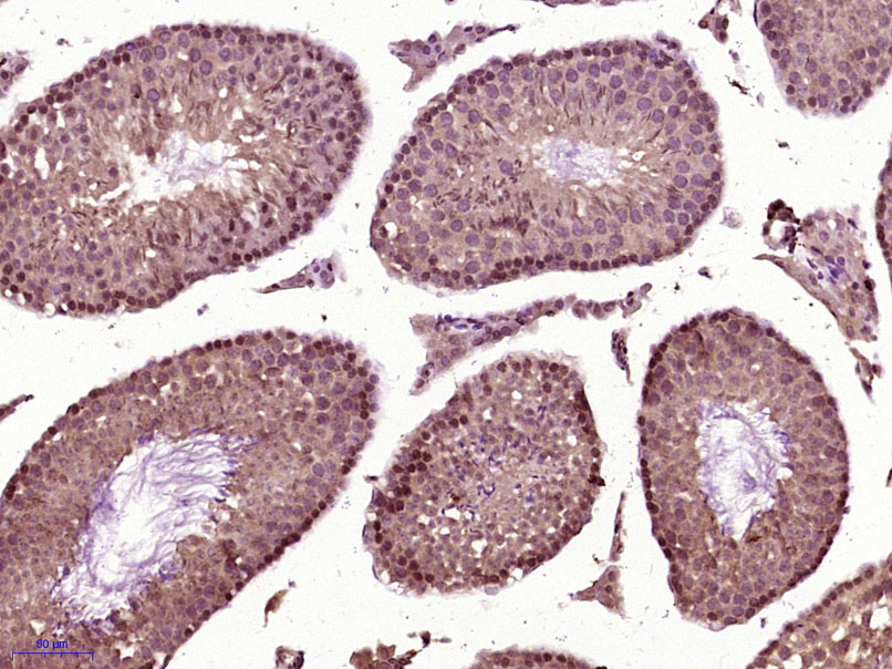 Paraformaldehyde-fixed, paraffin embedded (Mouse testis); Antigen retrieval by boiling in sodium citrate buffer (pH6.0) for 15min; Block endogenous peroxidase by 3% hydrogen peroxide for 20 minutes; Blocking buffer (normal goat serum) at 37°C for 30min; Antibody incubation with (SCNM1) Polyclonal Antibody, Unconjugated (bs-17293R) at 1:400 overnight at 4°C, followed by operating according to SP Kit(Rabbit) (sp-0023) instructionsand DAB staining.