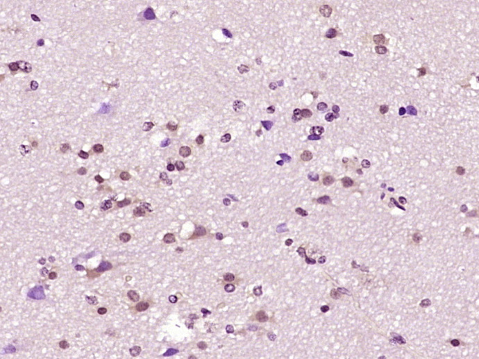 Paraformaldehyde-fixed, paraffin embedded (Human brain glioma); Antigen retrieval by boiling in sodium citrate buffer (pH6.0) for 15min; Block endogenous peroxidase by 3% hydrogen peroxide for 20 minutes; Blocking buffer (normal goat serum) at 37°C for 30min; Antibody incubation with (ZC3H7B) Polyclonal Antibody, Unconjugated (bs-18468R) at 1:400 overnight at 4°C, followed by operating according to SP Kit(Rabbit) (sp-0023) instructionsand DAB staining.