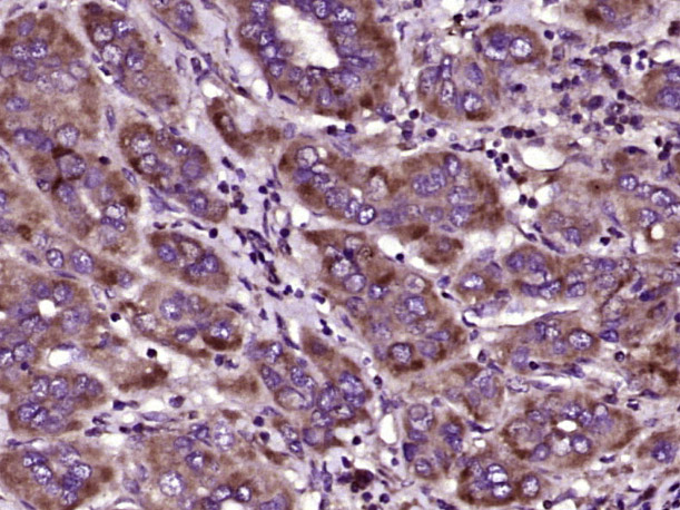 Paraformaldehyde-fixed, paraffin embedded (human liver carcinoma); Antigen retrieval by boiling in sodium citrate buffer (pH6.0) for 15min; Block endogenous peroxidase by 3% hydrogen peroxide for 20 minutes; Blocking buffer (normal goat serum) at 37°C for 30min; Antibody incubation with (OOSP1) Polyclonal Antibody, Unconjugated (bs-21093R) at 1:400 overnight at 4°C, followed by operating according to SP Kit(Rabbit) (sp-0023) instructionsand DAB staining.