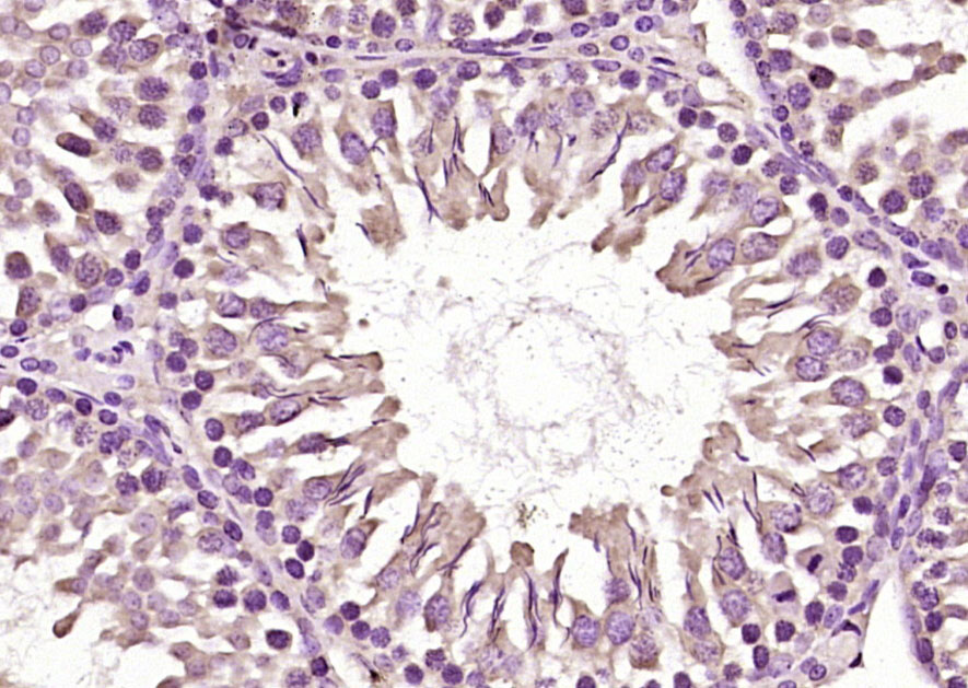 Paraformaldehyde-fixed, paraffin embedded (rat testis tissue); Antigen retrieval by boiling in sodium citrate buffer (pH6.0) for 15min; Block endogenous peroxidase by 3% hydrogen peroxide for 20 minutes; Blocking buffer (normal goat serum) at 37°C for 30min; Antibody incubation with (RSPO1) Polyclonal Antibody, Unconjugated (bs-21386R) at 1:200 overnight at 4°C, followed by operating according to SP Kit(Rabbit) (sp-0023) instructionsand DAB staining.