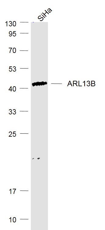 Sample: SiHa (Human) Cell Lysate at 30 ug Primary: Anti-ARL13B (bs-21493R) at 1/1000 dilution Secondary: IRDye800CW Goat Anti-Rabbit IgG at 1/20000 dilution Predicted band size: 49 kD Observed band size: 49 kD