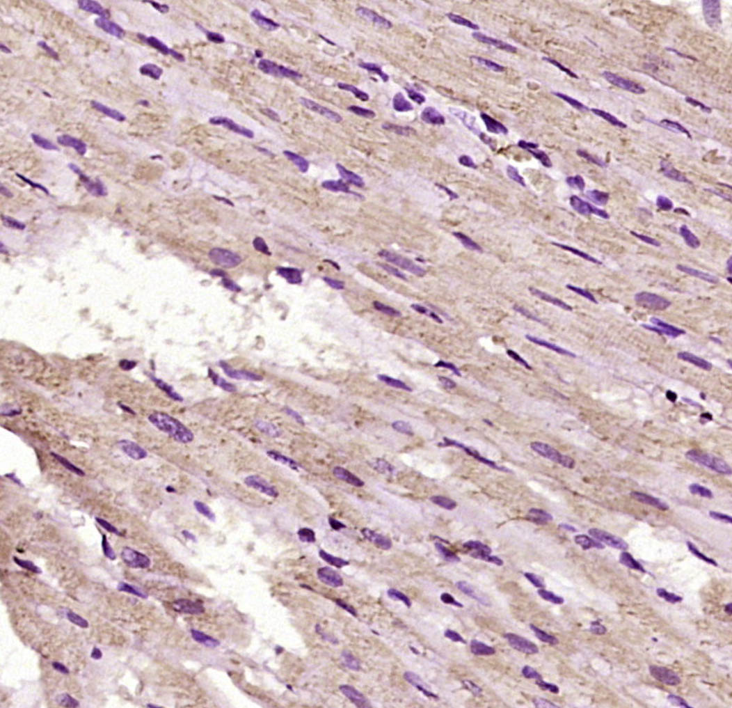 Paraformaldehyde-fixed, paraffin embedded (rat heart); Antigen retrieval by boiling in sodium citrate buffer (pH6.0) for 15min; Block endogenous peroxidase by 3% hydrogen peroxide for 20 minutes; Blocking buffer (normal goat serum) at 37°C for 30min; Antibody incubation with (EYA4) Polyclonal Antibody, Unconjugated (bs-21590R) at 1:400 overnight at 4°C, followed by operating according to SP Kit(Rabbit) (sp-0023) instructionsand DAB staining.