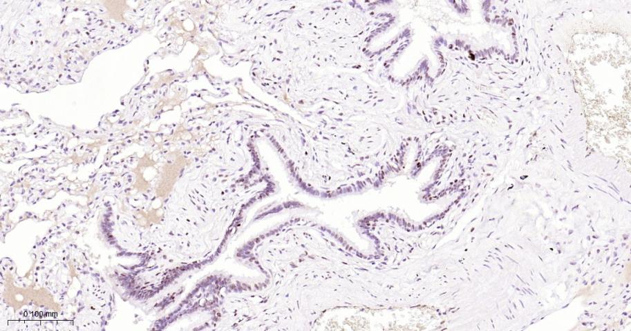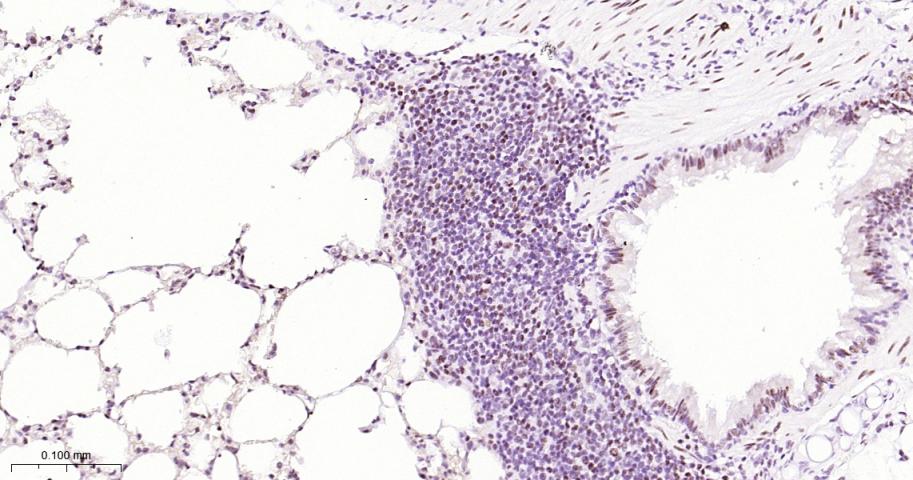 Paraformaldehyde-fixed, paraffin embedded Mouse Lung; Antigen retrieval by boiling in sodium citrate buffer (pH6.0) for 15 min; The section was incubated with FOXP1 Monoclonal Antibody, Unconjugated(bsm-52078R) at 1:200 overnight at 4°C, followed by conjugation to the bs-0295G-HRP and DAB (C-0010) staining.