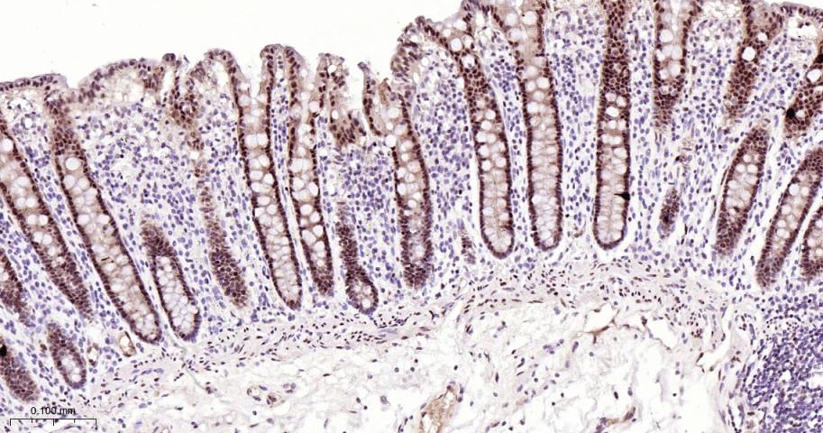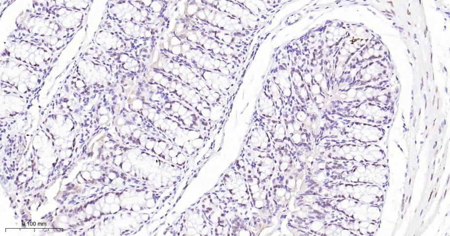 Paraformaldehyde-fixed, paraffin embedded Mouse Colon; Antigen retrieval by boiling in sodium citrate buffer (pH6.0) for 15 min; The section was incubated with FOXP1 Monoclonal Antibody, Unconjugated (bsm-52078R) at 1:200 overnight at 4°C, followed by conjugation to the bs-0295G-HRP and DAB (C-0010) staining.