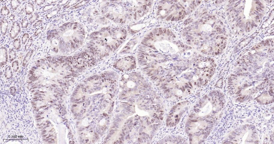 Paraformaldehyde-fixed, paraffin embedded Human Colon Cancer; Antigen retrieval by boiling in sodium citrate buffer (pH6.0) for 15 min; The section was incubated with FOXP1 Monoclonal Antibody, Unconjugated (bsm-52078R) at 1:200 overnight at 4°C, followed by conjugation to the bs-0295G-HRP and DAB (C-0010) staining.