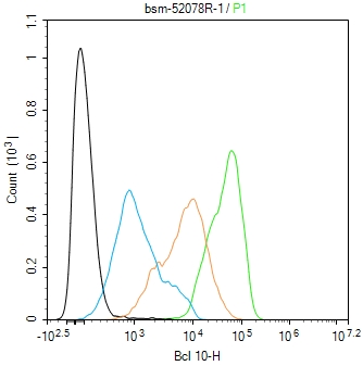The Raji (H) cells were fixed with 4% PFA (10 min at r.t.) and then permeabilized with 90% ice-cold methanol for 20 min at -20℃,the cells then were incubated in 5%BSA to block non-specific protein-protein interactions (30 min at r.t.).Primary Antibody (green):Rabbit Anti-FOXP1 antibody (bsm-52078R): 1:50-100; Secondary Antibody (white blue): Goat anti-Rabbit IgG-BF488 (bs-60295G-BF488): 1 μg/test. Isotype Control (orange): Rabbit IgG (bs-0295P). Blank control (black): PBS. Acquisition of 20,000 events was performed.