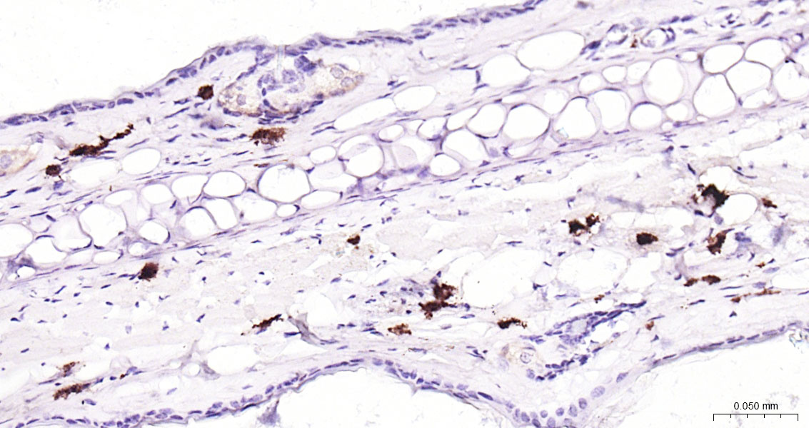 Paraformaldehyde-fixed, paraffin embedded (Mouse skin); Antigen retrieval by boiling in sodium citrate buffer (pH6.0) for 15min; Block endogenous peroxidase by 3% hydrogen peroxide for 20 minutes; Blocking buffer (normal goat serum) at 37°C for 30min; Incubation with (Mast Cell Tryptase) Monoclonal Antibody, Unconjugated (bsm-52533R) at 1:200 overnight at 4°C, followed by operating according to SP Kit(Rabbit) (sp-0023) instructionsand DAB staining.