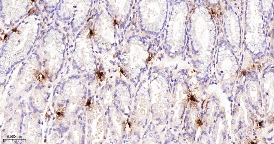 Paraformaldehyde-fixed, paraffin embedded (human stomach); Antigen retrieval by boiling in sodium citrate buffer (pH6.0) for 15min; Block endogenous peroxidase by 3% hydrogen peroxide for 20 minutes; Blocking buffer (normal goat serum) at 37°C for 30min; Incubation with (Mast Cell Tryptase) Monoclonal Antibody, Unconjugated (bsm-52533R) at 1:200 overnight at 4°C, followed by operating according to SP Kit(Rabbit) (sp-0023) instructionsand DAB staining.