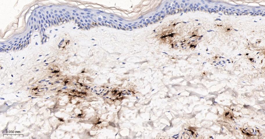 Paraformaldehyde-fixed, paraffin embedded (human skin); Antigen retrieval by boiling in sodium citrate buffer (pH6.0) for 15min; Block endogenous peroxidase by 3% hydrogen peroxide for 20 minutes; Blocking buffer (normal goat serum) at 37°C for 30min; Incubation with (Mast Cell Tryptase) Monoclonal Antibody, Unconjugated (bsm-52533R) at 1:200 overnight at 4°C, followed by operating according to SP Kit(Rabbit) (sp-0023) instructionsand DAB staining.