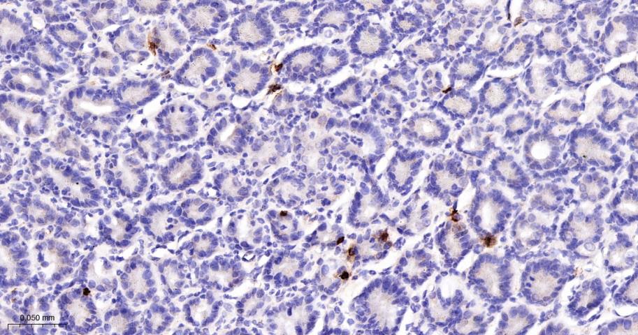 Paraformaldehyde-fixed, paraffin embedded (Mouse stomach); Antigen retrieval by boiling in sodium citrate buffer (pH6.0) for 15min; Block endogenous peroxidase by 3% hydrogen peroxide for 20 minutes; Blocking buffer (normal goat serum) at 37°C for 30min; Incubation with (Mast Cell Tryptase) Monoclonal Antibody, Unconjugated (bsm-52533R) at 1:200 overnight at 4°C, followed by operating according to SP Kit(Rabbit) (sp-0023) instructionsand DAB staining.