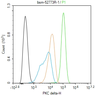 The Hela (H) cells were fixed with 4% PFA (10 min at r.t.) and then permeabilized with 90% ice-cold methanol for 20 min at -20℃,the cells then were incubated in 5%BSA to block non-specific protein-protein interactions (30 min at r.t.).Primary Antibody (green):Rabbit Anti-PKC delta antibody (bsm-52773R,1:100); Secondary Antibody (white blue): Goat anti-Rabbit IgG-BF488 (bs-60295G-BF488): 1 μg/test. Isotype Control (orange): Rabbit IgG (bs-0295P). Blank control (black): PBS. Acquisition of 20,000 events was performed.