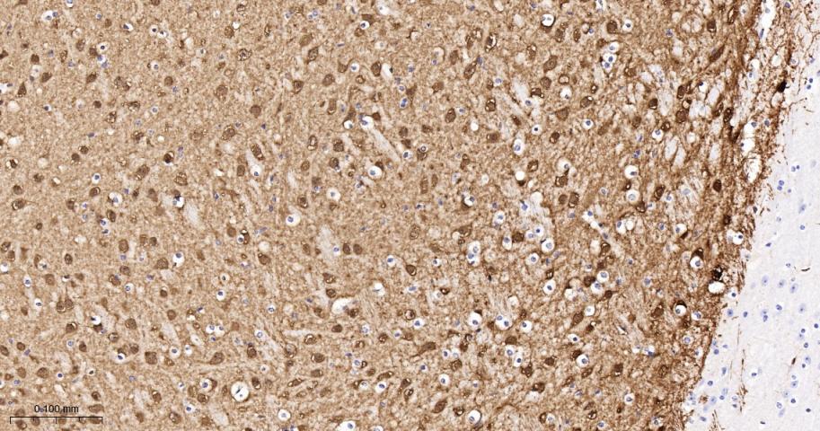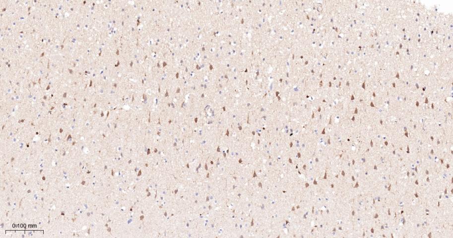 Paraformaldehyde-fixed, paraffin embedded Human Cerebrum; Antigen retrieval by boiling in sodium citrate buffer (pH6.0) for 15 min; The section was incubated with PKC delta Monoclonal Antibody, Unconjugated (bsm-52773R) at 1:200 overnight at 4°C, followed by conjugation to the bs-0295G-HRP and DAB (C-0010) staining.