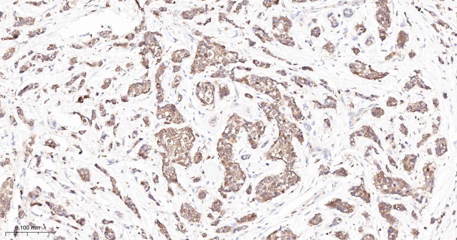Paraformaldehyde-fixed, paraffin embedded Human Breast Cancer; Antigen retrieval by boiling in sodium citrate buffer (pH6.0) for 15 min; The section was incubated with PKC delta Monoclonal Antibody, Unconjugated (bsm-52773R) at 1:200 overnight at 4°C, followed by conjugation to the bs-0295G-HRP and DAB (C-0010) staining.
