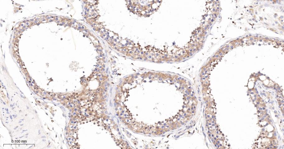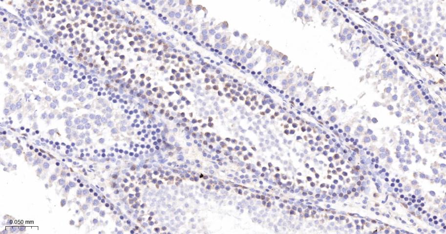 Paraformaldehyde-fixed, paraffin embedded Mouse Testicles; Antigen retrieval by boiling in sodium citrate buffer (pH6.0) for 15 min; The section was incubated with PKC delta Monoclonal Antibody, Unconjugated (bsm-52773R) at 1:200 overnight at 4°C, followed by conjugation to the bs-0295G-HRP and DAB (C-0010) staining.