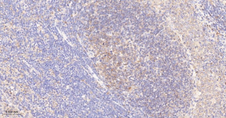 Paraformaldehyde-fixed, paraffin embedded Human Spleen; Antigen retrieval by boiling in sodium citrate buffer (pH6.0) for 15 min; The section was incubated with PKC delta Monoclonal Antibody, Unconjugated (bsm-52773R) at 1:200 overnight at 4°C, followed by conjugation to the bs-0295G-HRP and DAB (C-0010) staining.