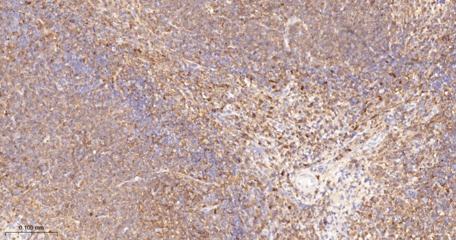 Paraformaldehyde-fixed, paraffin embedded Mouse Spleen; Antigen retrieval by boiling in sodium citrate buffer (pH6.0) for 15 min; The section was incubated with PKC delta Monoclonal Antibody, Unconjugated (bsm-52773R) at 1:200 overnight at 4°C, followed by conjugation to the bs-0295G-HRP and DAB (C-0010) staining.