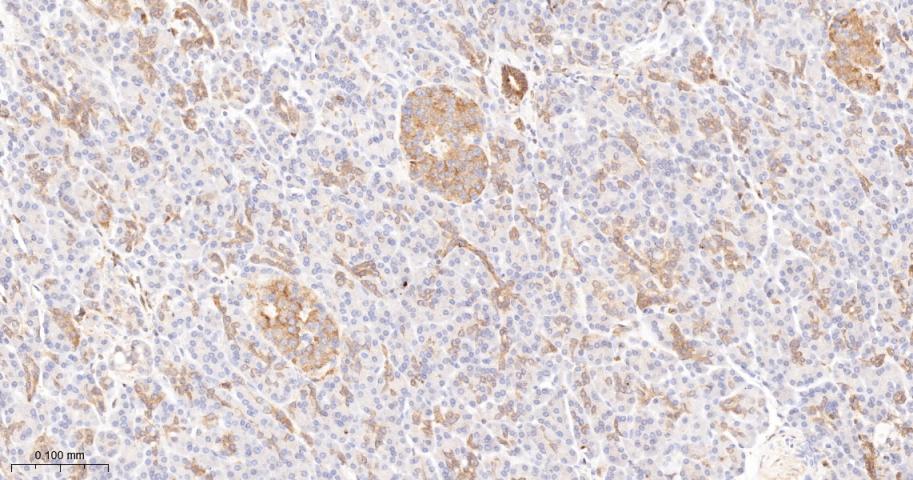 Paraformaldehyde-fixed, paraffin embedded Human Pancreas; Antigen retrieval by boiling in sodium citrate buffer (pH6.0) for 15 min; The section was incubated with PKC delta Monoclonal Antibody, Unconjugated (bsm-52773R) at 1:200 overnight at 4°C, followed by conjugation to the bs-0295G-HRP and DAB (C-0010) staining.