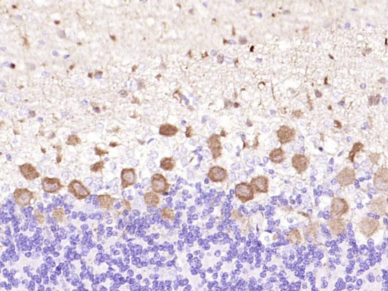 Paraformaldehyde-fixed, paraffin embedded (rat cerebellum); Antigen retrieval by boiling in sodium citrate buffer (pH6.0) for 15min; Block endogenous peroxidase by 3% hydrogen peroxide for 20 minutes; Blocking buffer (normal goat serum) at 37°C for 30min; Antibody incubation with (PKC delta ) Monoclonal Antibody, Unconjugated (bsm-52773R ) at 1:200 overnight at 4°C, followed by operating according to SP Kit(Rabbit) (sp-0023) instructionsand DAB staining.
