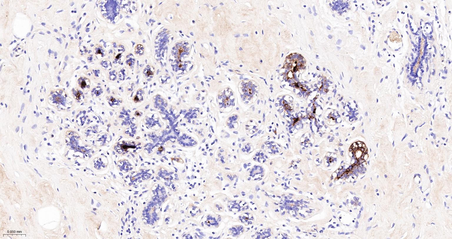 Paraformaldehyde-fixed, paraffin embedded Human Breast; Antigen retrieval by boiling in sodium citrate buffer (pH6.0) for 15 min; The section was incubated with GCDFP15 Monoclonal Antibody, Unconjugated (bsm-54667R) at 1:300 overnight at 4°C, followed by conjugation to the bs-0295G-HRP and DAB (C-0010) staining.
