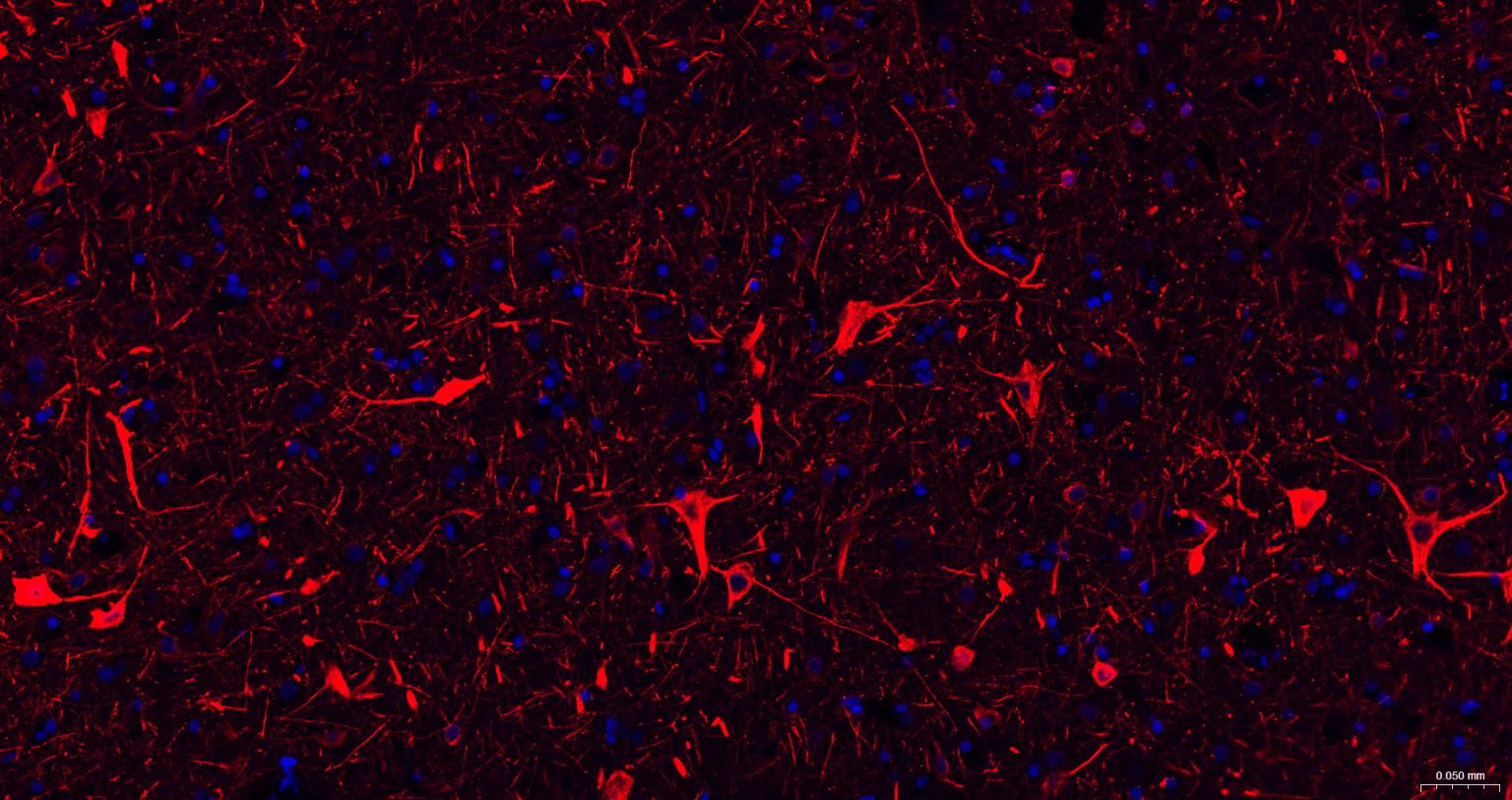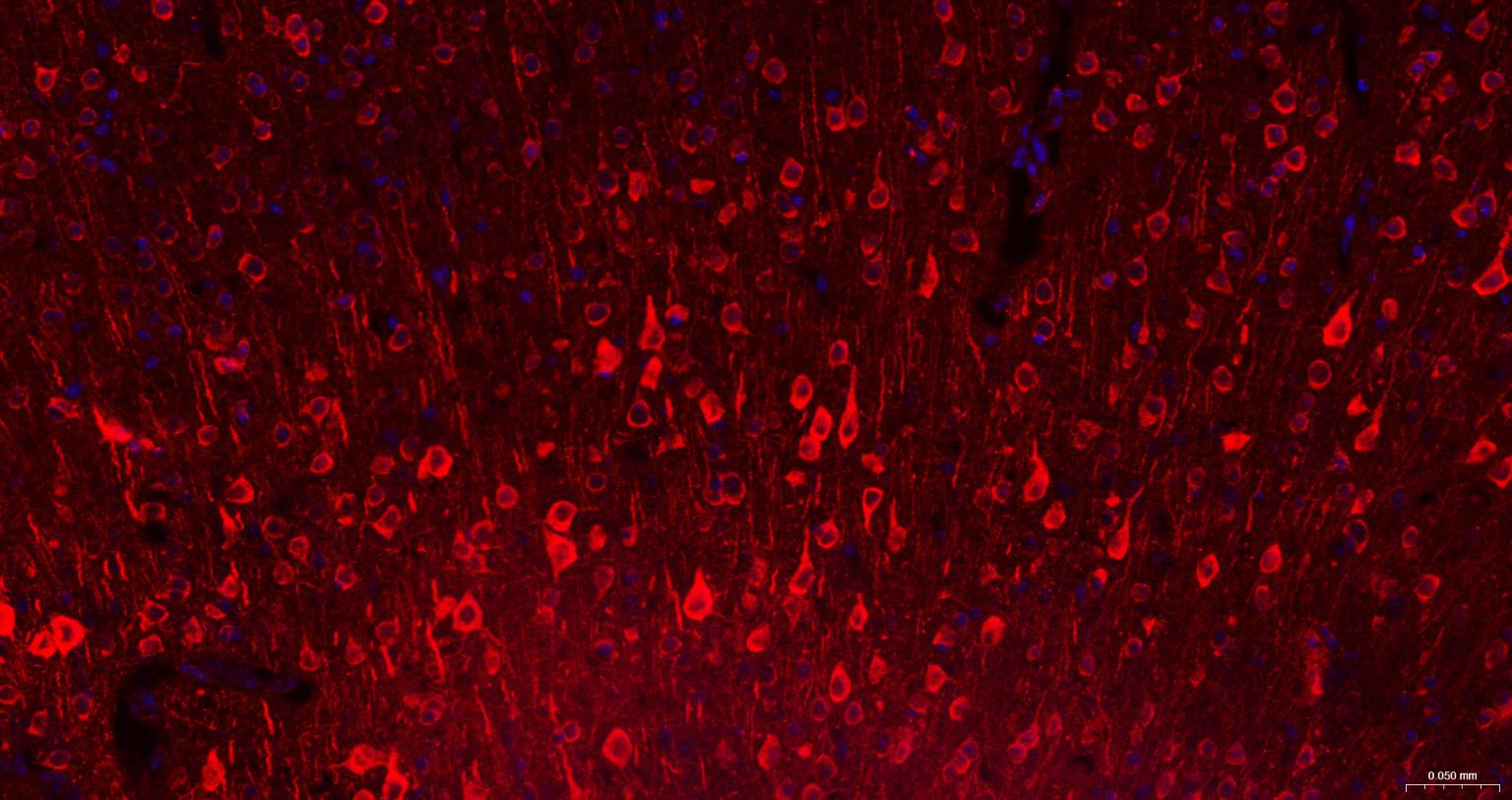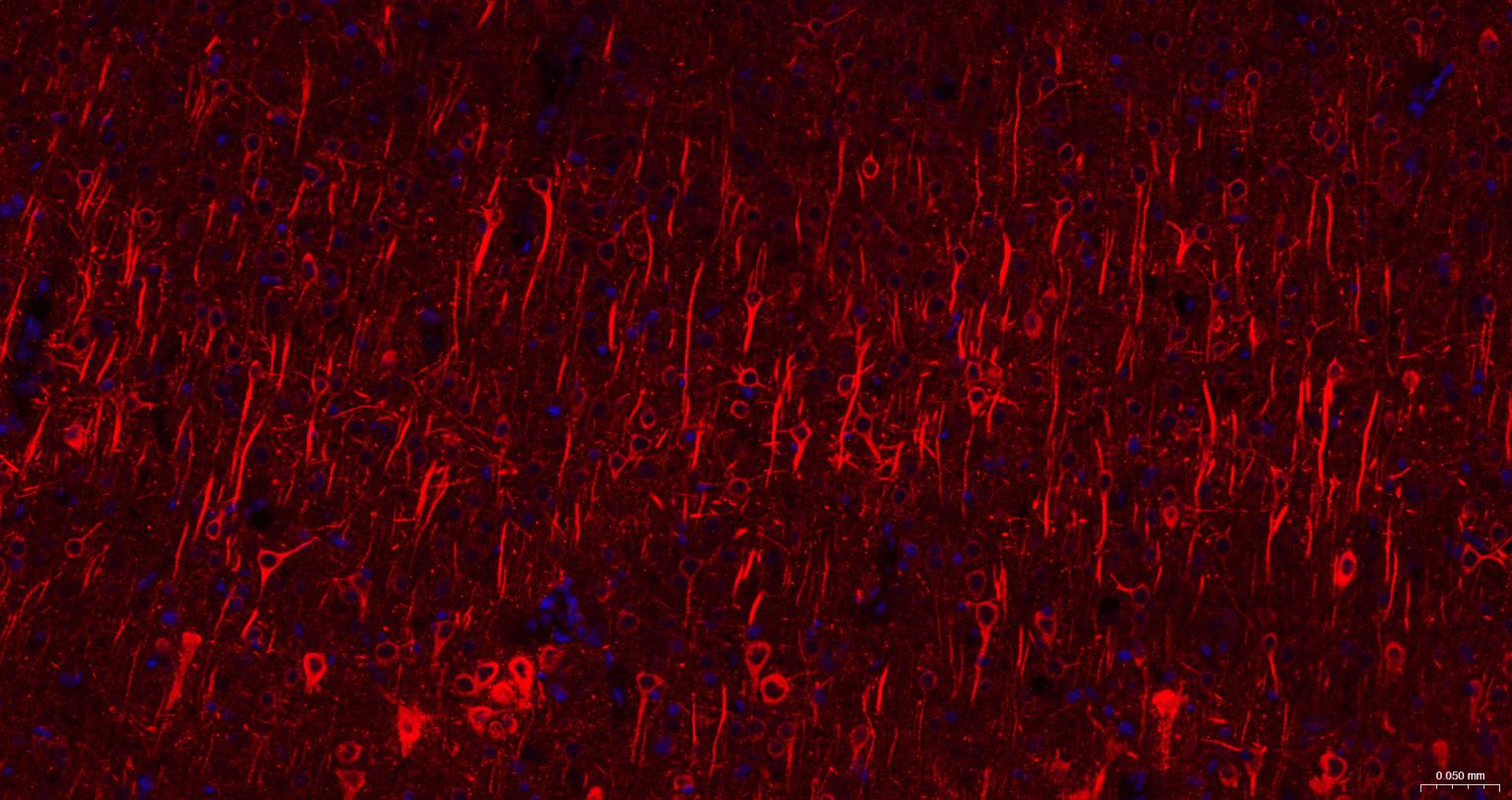 Paraformaldehyde-fixed, paraffin embedded Rat Cerebrum; Antigen retrieval by boiling in sodium citrate buffer (pH6.0) for 15 min; The section was incubated with NF-H Monoclonal Antibody, Unconjugated (bsm-52851R) at 1:200 overnight at 4°C. Followed by conjugated Goat Anti-Rabbit IgG antibody (Red, bs-0295G-BF594), DAPI (blue, C02-04002) was used to stain the cell nuclei.