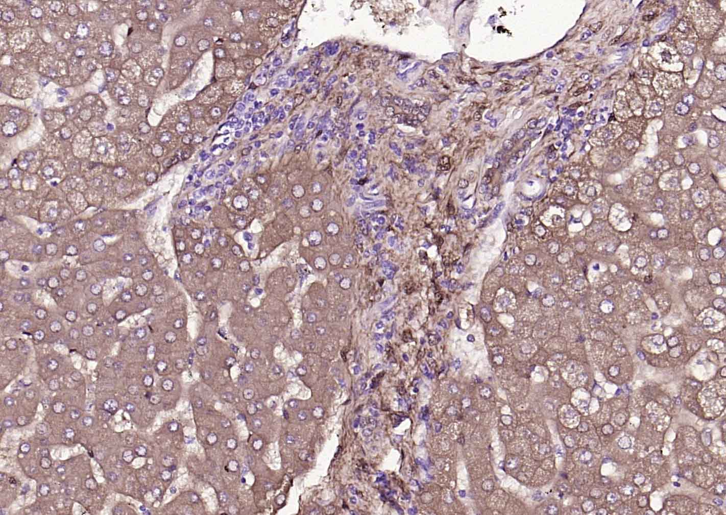 Paraformaldehyde-fixed, paraffin embedded (human liver); Antigen retrieval by boiling in EDTA buffer (Ph9.0) for 15min; Block endogenous peroxidase by 3% hydrogen peroxide for 20 minutes; Blocking buffer (normal goat serum) at 37°C for 30min; Incubation with (ALDH1A1) Monoclonal Antibody, Unconjugated (bsm-60321R) at 1:200 overnight at 4°C, followed by operating according to SP Kit(Rabbit) (sp-0023) instructionsand DAB staining.