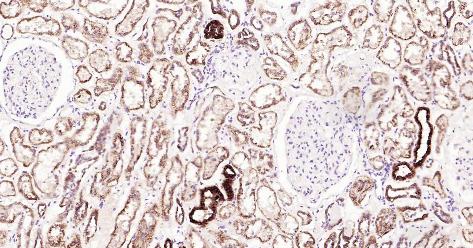 Paraformaldehyde-fixed, paraffin embedded Human Kidney; Antigen retrieval by boiling in sodium citrate buffer (pH6.0) for 15 min; Antibody incubation with Osteopontin? Monoclonal Antibody, Unconjugated(bsm-43600R) at 1:200 overnight at 4°C, followed by conjugation to the SP Kit (Rabbit, SP-0023)and DAB (C-0010) staining.